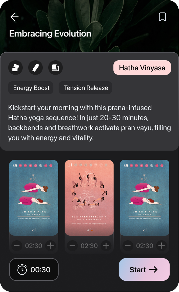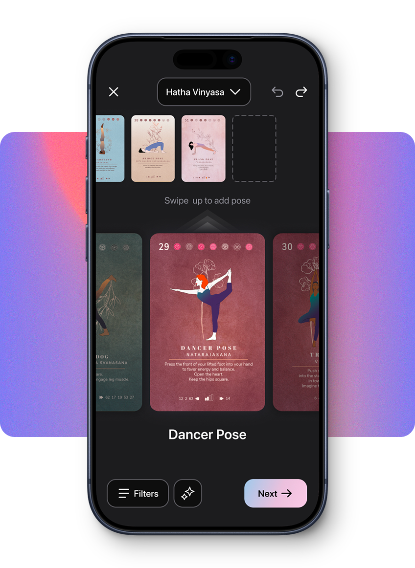 Floga lets you design complete flows in seconds—filter by style, category, chakra, or benefit. The app can even suggest poses that naturally follow, helping your sequences unfold with clarity and purpose.